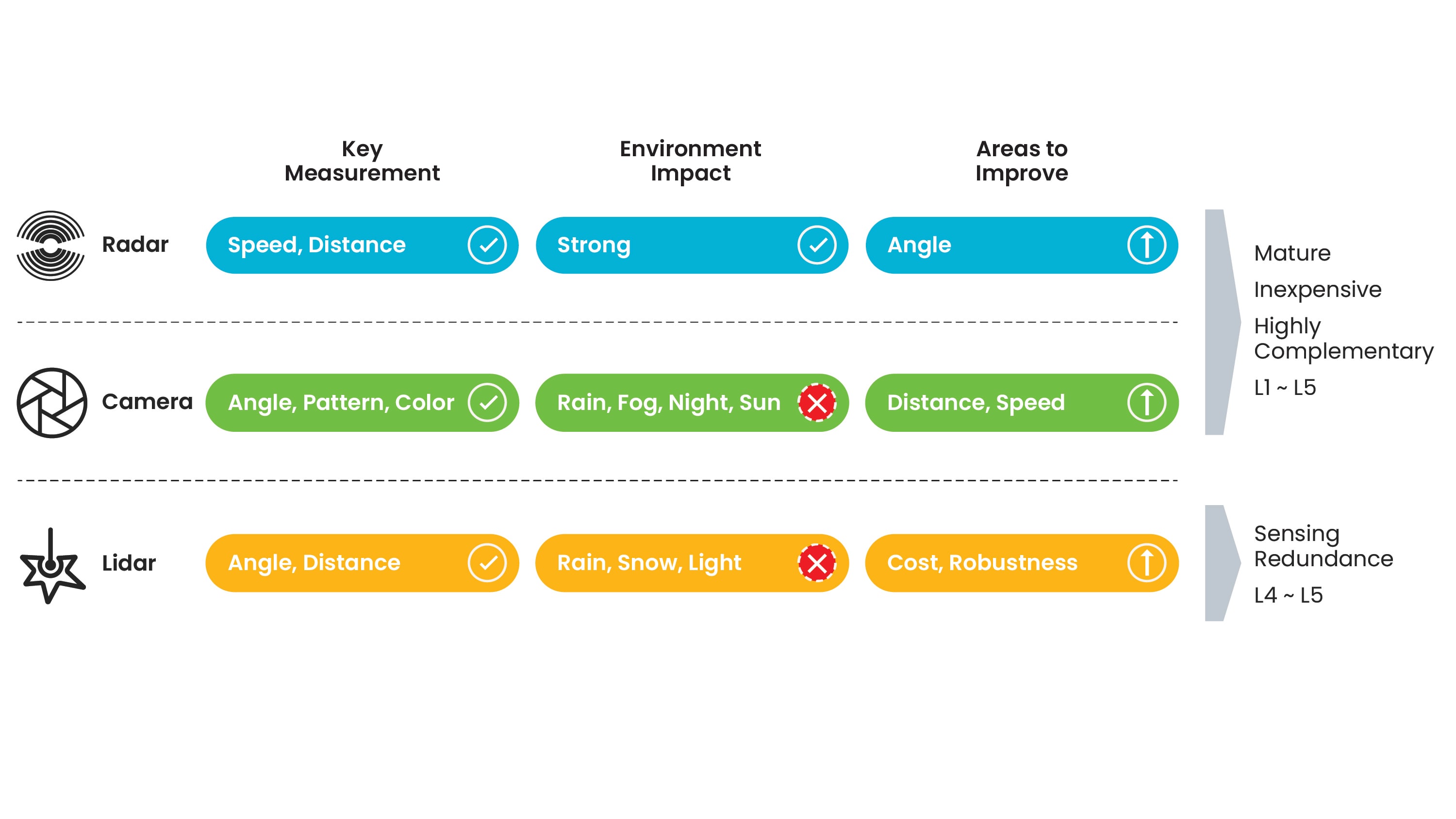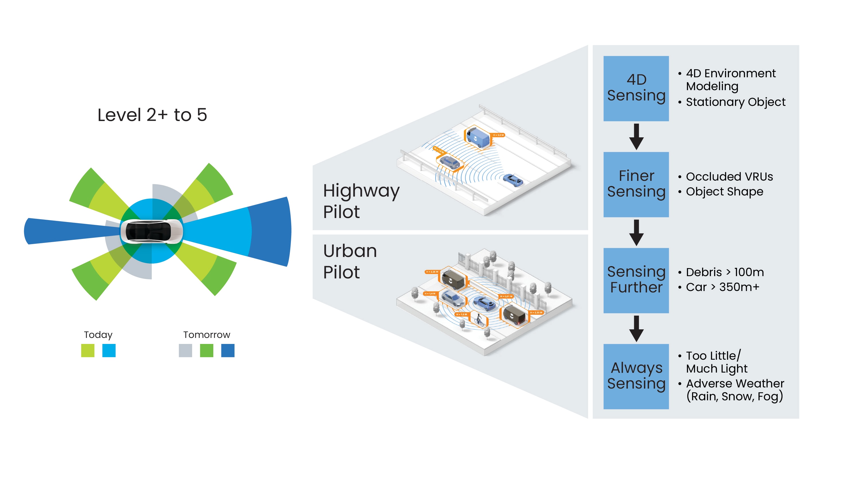 2つの主要なユース・ケース、ハイウェイ・パイロット とアーバン・パイロット では、4Dイメージング・レーダーの重要な役割が特に際立ちます。ハイウェイ・パイロットでは、遠くの距離にある動きの速い物体を検知し、高速での安全な操縦を確保することが求められます。対照的に、アーバン・パイロットでは、静止している障害物と動いている障害物の両方が多く存在する複雑な環境をナビゲートする必要があり、数多くの物体を正確かつ同時に検知することが求められます。これらの課題に対応するために、4Dイメージング・レーダーは包括的な空間認識、高精度の環境検知、および長距離の検知能力を備えており、これらのすべてにより悪条件でも確実に動作します。また、従来のレーダーやカメラ、LiDAR (Light Detection And Ranging) とは異なり、4Dイメージング・レーダーはより高いレベルの自動運転に必要な全範囲の検知要件に対応します。