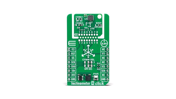 また、MikroEと提携して小型フォーム・ファクタのクリック・ボードを開発し、センサ開発エコシステムを拡大しています。Inclinometer 4 Clickは、mikroBUS™ソケットと完全に互換性があり、mikroBUS™規格をサポートするホスト・システムで使用できます。