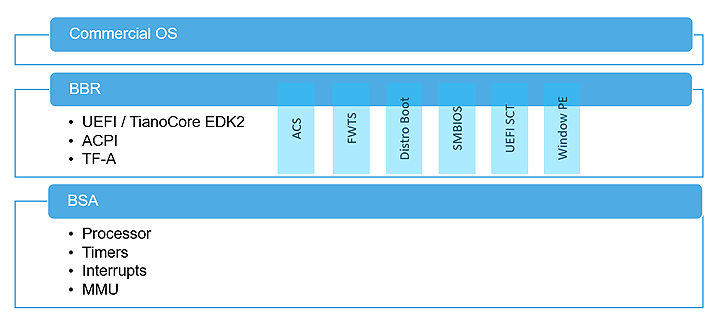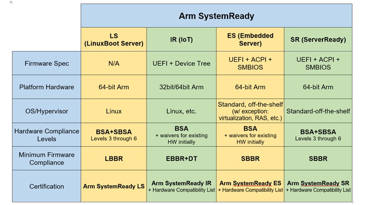 Project Cassini defines four bands to their SystemReady designation. The LinuxBoot Server designation is to ensure a server platform is suitable for deployment on the LinuxBoot firmware stack, the IR designation is for devices in the IoT edge sector and the SR is for deploying Arm servers. Embedded server (ES) designation is for deploying server workloads in Arm-based processors in edge compute platforms. There are two components to the ES designation. The base system architecture (BSA) defines the minimum hardware requirement to deploy an operating system. The base boot requirement (BBR) is the firmware component that provides a standard firmware interface to the operating system. The architecture compliance suite validates BSA at the hardware level and has many tests that cover the various aspects of the BBR.