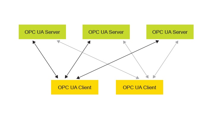 クライアント/サーバ・モデルは、多くのユースケースで適切に機能します。クライアントは、必要としている情報アクセスを自ら行う必要があります。複数のクライアントが1台のOPC UAサーバから同じデータを得る必要がある場合、各クライアントが別々にデータを要求する必要があります。この手法の場合、ネットワーク・トラフィックとシステムの複雑性が大幅に増加する恐れがあります。