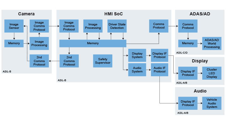 機能安全には、潜在的な危険に対処する堅牢なコンセプトも必要です(カメラ/HMIシステム・オン・チップ (SoC) に関するASIL-B、ADAS/ADインターフェースに関するASIL-C/D、ディスプレイ/オーディオに関するASIL-A/Bなど)。複数のハードウェア/ソフトウェア・セーフティ・メカニズム(冗長性、エラー検出、ランタイム監視など)が組み合わされます。OSの選定では、性能と安全性のバランスに配慮します(高性能かつ安全性認定を受けたリアルタイム・オペレーティング・システム (RTOS) が最適)。下の図は、HMI SoC (検知) とADAS/ADユニット(計画、処置)の分離を示しています。これらの要素により、堅牢で効率的なDMSが実現できます。