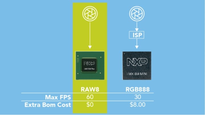 An integrated ISP provides several significant advantages over a discrete ISP. When receiving image data in a RAW format we can achieve bandwidth savings over full color RGB or YUV. A 4K image (3840 x 2160). Using the 8-bit RAW format can achieve 60 frames per second (FPS) on the i.MX 8M Plus applications processor. If a discrete ISP was used in your system design, and the output uses the RGB888 format, the i.MX 8M Plus processor is bandwidth limited to 30 FPS. Using the RAW format allows system designers to either use less MIPI lanes or accommodate larger frame sizes or frame rates.