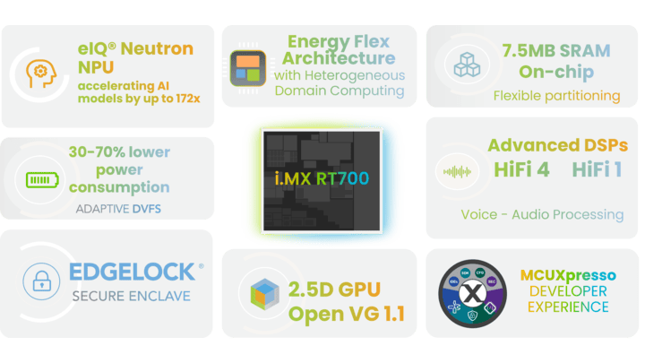 NXPは、i.MX RT500およびi.MX RT600クロスオーバーMCUの実績を礎に、eIQ® Neutronニューラル・プロセッシング・ユニット (NPU) を統合した超低消費電力マルチコアi.MX RT700を発表しました。