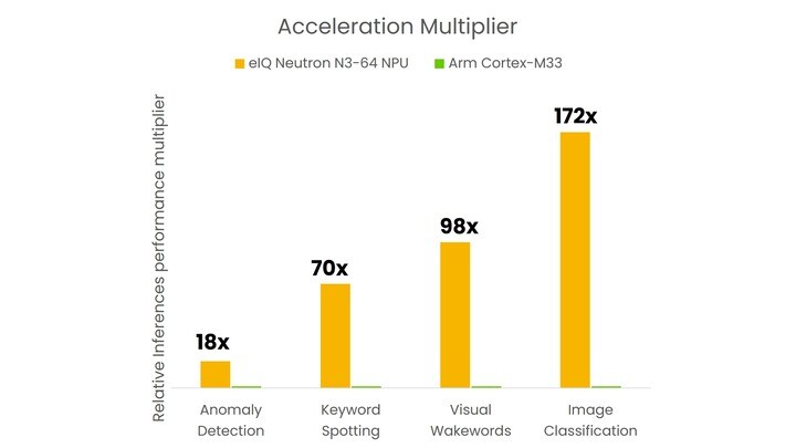 i.MX RT700はeIQ Neutron N3-64 NPUを搭載しており、その能力はMCX N947 MCUのN1-16とハイエンドi.MX 95アプリケーション・プロセッサのN3-1024の中間に位置します。このNPUは、低消費電力の深い組込みアプリケーション向けにチューニングされており、汎用プロセッサと比較して、推論あたりの消費電力を最大119倍削減すると同時に、172倍のパフォーマンスを発揮します。