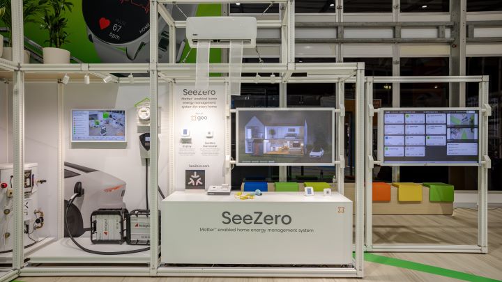 このデモでは、英国のgeo (Green Energy Options, Ltd.) によって設計された次世代のHEMSシステム「SeeZero」を披露しました。SeeZeroは、世界初の量産市場向けMatter対応宅内ディスプレイであり、NXPのシリコン技術を活用してZigBeeスマート・メーターならびにWi-FiデバイスやThreadデバイスと接続し、Matterでのエネルギー管理を実現しています。
