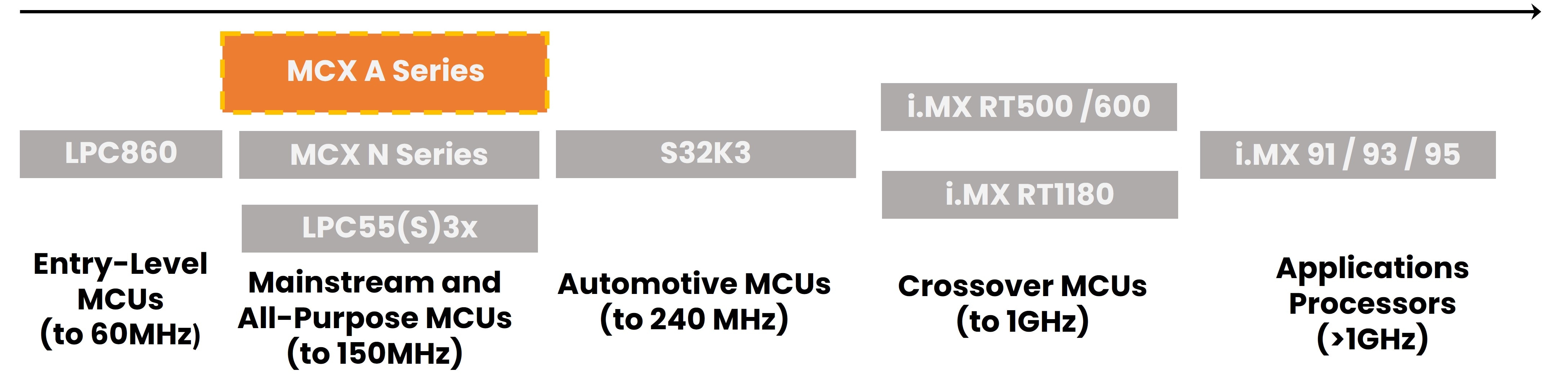 MCX Aは、MIPI I3Cなどの独自のペリフェラルを活用してモータ制御、センシング、および関連する産業用アプリケーションに対応する、MCXポートフォリオの重要な部分です。MCX A14xとA15xは、ほんの始まりにすぎません。MCX Aシリーズは、2024年以降も引き続き拡張され、パッケージのピン互換性を保持しながら、より多くのフラッシュやRAMを搭載した新しいファミリやバリエーションが加わる予定です。