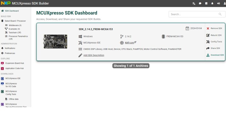 最新のSDKパッケージを入手する方法の1つは、オンラインのMCUXpresso SDK Builderを使用することです。