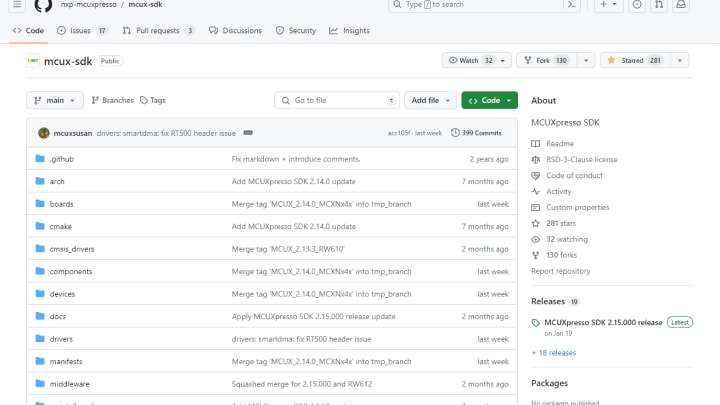 SDKは、MCUXpresso IDE内から直接、またはMCUXpresso for VS Codeからも取得できます。特定のデバイス用のスタンドアロンSDKを生成するだけでなく、開発者はNXPのGitHub リポジトリからリリースを直接取得できます。