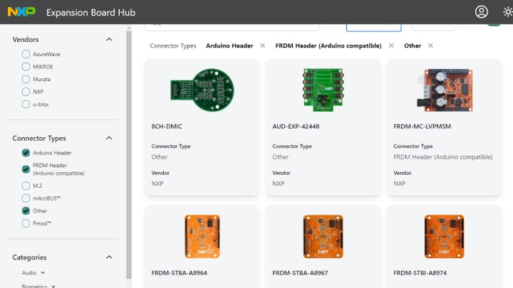 FRDMプラットフォームは長年にわたり開発者の間で人気がありました。Arduino®互換のピン・ヘッダーを介してI/Oに簡単にアクセスできます。MCX Aのペリフェラルに完全にアクセスできるように、追加のピン列が用意されています。また、mikroBUS とDigilent PMOD™ 用のソケットも含まれています。拡張ボード・ハブ (EBH) には、互換性のある拡張ボードと「シールド」が用意されています。