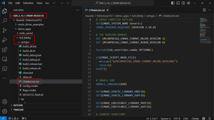 ますます多くの組込みプロジェクトが、継続的な統合と継続的な展開ワークフローに依存しています。マイクロコントローラ開発ではIDEベースのプロジェクトが一般的ですが、MCX AのツールはCI/CDパイプラインですぐに使えるコマンド・ライン・ビルドもサポートしています。SDKにはCMakeスクリプトが含まれ、Makeなどの好みのビルド・ツールや高速なNinjaビルド・システムで使用できます。