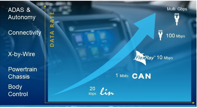 Traditional vehicle network protocols, including Lin, and CAN, operate on lower bandwidth speeds that are designed for simpler tasks such as body control in high-volume models. Even FlexRay, currently the fastest at 10 megabytes per second, is significantly slower than the multi-gigabyte speed required for more deterministic tasks in autonomous cars.