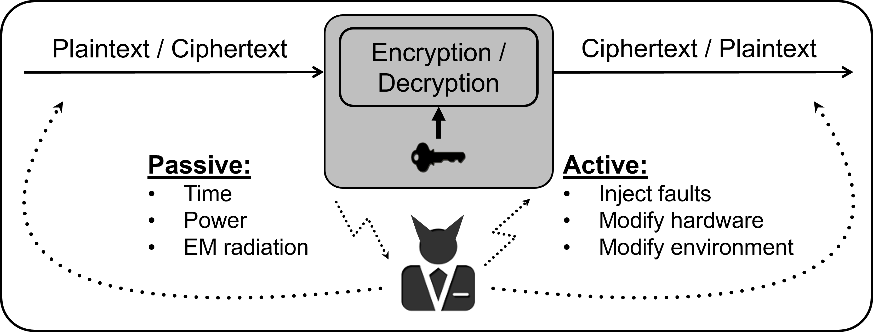 Cryptographic algorithms are typically implemented in a dedicated, highly secure segment of a system. Users of the system (including malicious ones) can submit inputs and observe the outputs, but cannot obtain information about any internal values, including the secret cryptographic data. In other words, the cryptographic engine is implemented as a “black box", and in effect, all contemporary and relevant post-quantum cryptographic algorithms are believed to provide sufficient security guarantees against a black box attacker.