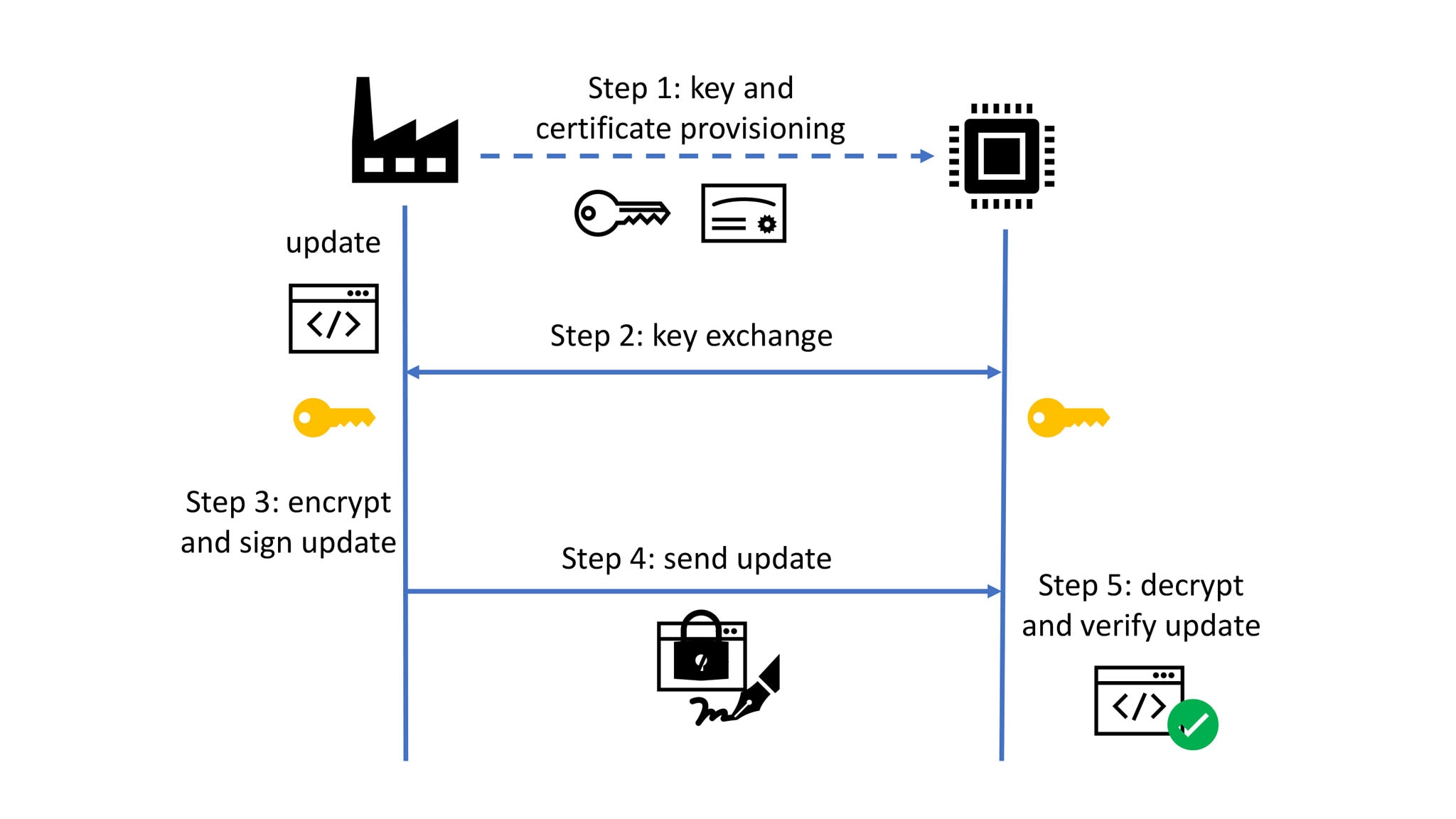 Cryptography, and in particular, public key cryptography, is essential for accomplishing secure updates. An update image is usually signed, such that any receiving device can authenticate its source. In addition, it is often encrypted to protect any sensitive information or intellectual property it might contain. The figure below shows an exemplary update flow. Initially, before the device is deployed, secret and public keys and any corresponding certificates can be provisioned into the device. This includes the update provider’s public signature key. If the device requires an update at any point during its lifetime, in the second step the update provider and the device establish an ephemeral shared secret key to symmetrically encrypt and decrypt the update image. In the post-quantum era, this secret key could be shared using the Kyber Key Encapsulation Mechanism (KEM). The update is then signed, encrypted and transmitted to the device during the third and fourth step. Finally, the device verifies the signature of the received update to authenticate its source and decrypts it in order to install it.