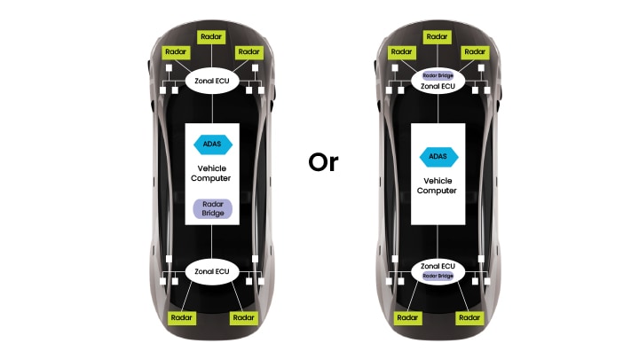 ゾーン型またはセントラル型のセンサ・データ処理を可能にする分散型レーダー・アーキテクチャは、センサの機能とセンサ・フュージョンを管理する高度な手法であり、次世代のレーダー・センサの潜在能力を引き出すために不可欠です。上で説明したレーダー・ブリッジは、ゾーン型またはセントラル型のプロセッシング・プラットフォームで得られたレーダー・センサのデータを処理して統合化し、それを視覚認識データとさらに統合することができます。このタイプのレーダー・プロセッサは幅広い用途に対応し、ポイント・クラウドとレーダー・オブジェクトのどちらも出力できます。レーダー・ブリッジは、セントラルECUの視覚処理プロセッサやゾーンECUのゾーン・コントローラと同じ場所に配置できます。