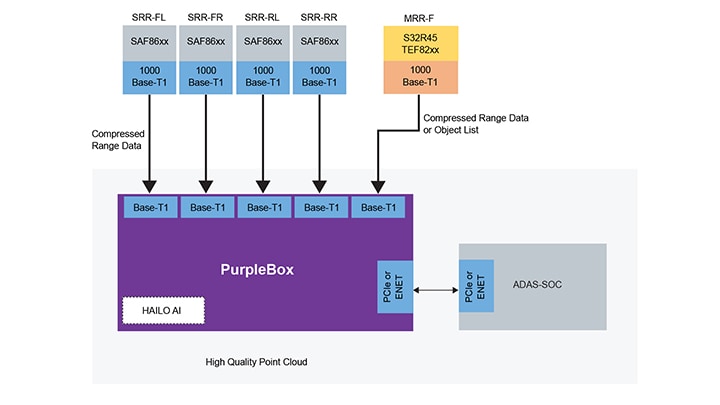 このたびNXPは、リファレンス・デザイン「PurpleBox」を開発しました。この製品は、分散型レーダー・アーキテクチャの概念を評価する際や、アーリー・レーダー・フュージョンを導入する際に役立ちます。このリファレンス・デザインは26 TOPSの性能を誇るHailo製の機械学習アクセラレータを使用したAI拡張機能を備え、レーダー・データをまったく新しい方法で活用することができます。