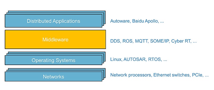 To compete in this market, car manufacturers need to quickly and easily build modular distributed applications, which require programmable, reliable and cost-effective semiconductor devices to run on. Therefore, standardized software platforms with easy-to-use application programming interfaces (APIs), such as POSIX and AUTOSAR® , are becoming more popular. A key component in these software platforms is the middleware, the software layer between the various operating systems and high-level applications (see the figure below). Simply put, the middleware is a software library that enables distributed system components to communicate with each other. The safety of software-defined cars highly depends on the middleware and the underlying network processors for reliable real-time data communication among distributed processes.