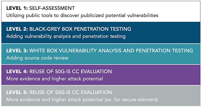 SESIP保証には5つのレベルがあり、自己評価から徹底的な分析までの段階に分かれていることから、デバイス製造メーカーはニーズに最適なものを選択できます。これが結果的に、デバイス製造メーカーによるデバイスの改良に役立っています。またエンド・ユーザーはこれを利用して、リスク評価に応じてSESIP認定デバイスを選択できます。