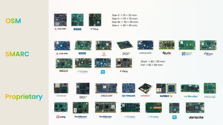 | 適切なモジュールの選択 | はんだ付け可能で超低消費電力。厳しい環境や産業用途に最適。エッジ・コンピューティングやAIに適した高いスケーラビリティ。 | 柔軟なI/Oとディスプレイ・オプション。マルチメディア、自動化、ロボティクスに最適。 | ベンダーごとに特定のアプリケーションに向けてカスタマイズ。最適化されたパフォーマンスと独自の機能を提供。 |
