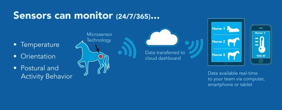 Non-invasive microsensors provide continuous bio monitoring for early detection of laminitis, fever, colic and even foaling.
