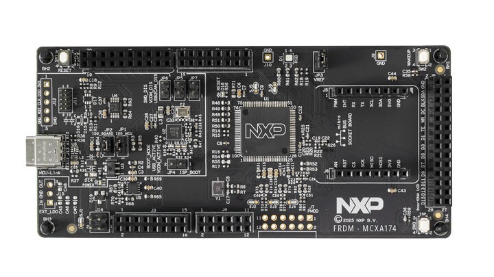FRDM-MCXA174 is a compact and scalable development board for rapid prototyping of MCX A173 and A174 microcontroller units (MCUs). They offer industry standard headers for easy access to the MCU's I/Os, integrated open-standard serial interfaces, external flash memory and an on-board MCU-Link debugger. Additional tools like our Expansion Board Hub (EBH) for add-on boards and the Application Code Hub (ACH) for software examples are available through the MCUXpresso Developer Experience.