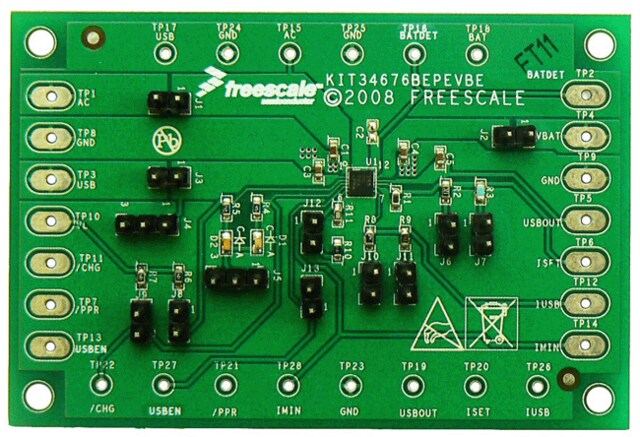 The Evaluation Kit supports the 34676, which is a dual 28V input voltage and fully-integrated single cell Li-Ion battery charger, targeting smart handheld applications. One of the inputs is optimized for charging with a USB port, and the second is optimized for an AC/DC adapter power source. The charger has two 28V power devices, that eliminate the need for any external power source selection and input over-voltage protection circuitry. Each of the power devices independently controls the charge current from the input, and performs as an independent charger. Only one of the two chargers operate at a time.