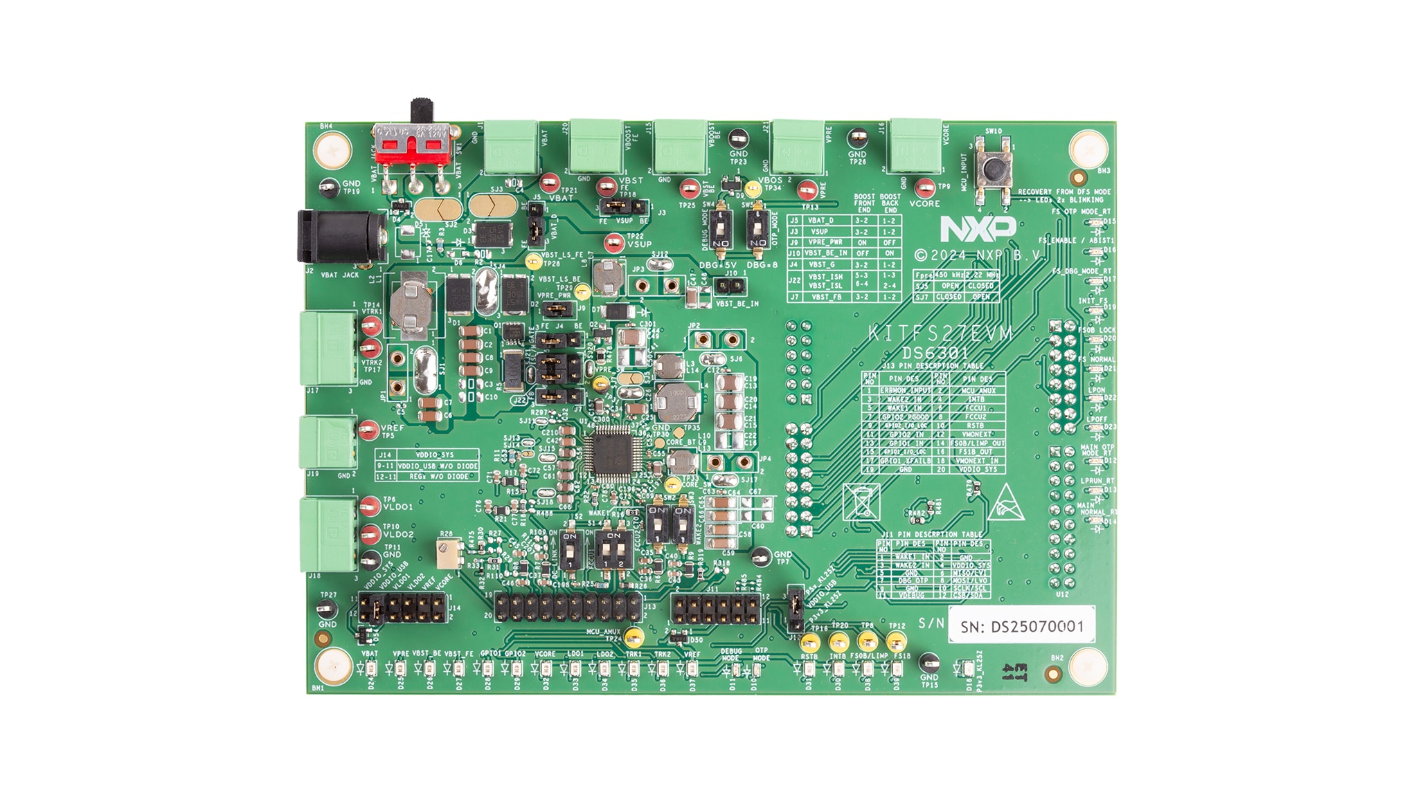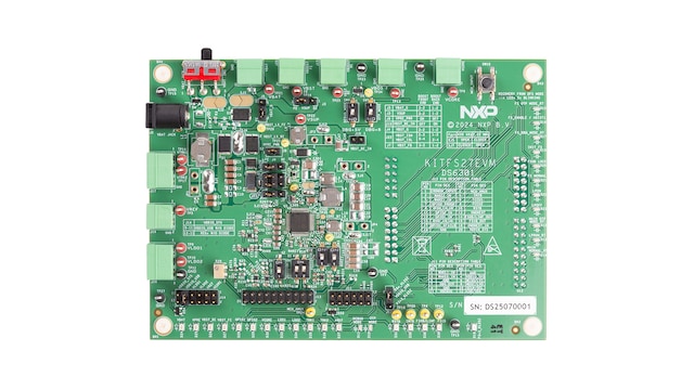 このボードには、デバイスの評価のために、FS27ファミリの上位互換製品が実装されています。ボードにはんだ付けされた製品は、プログラミング (OTP) を3回実行でき、プログラミング前後にエミュレーション・モードで必要な数の構成をテストすることが可能です。デバイスのプログラミングに、追加のツールやボードは必要ありません。