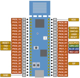 The LPC845 breakout board features an on-board CMSIS-DAP debug and VCOM port, RGB user LEDs, capacitive touch button, user potentiometer and allows an easy prototyping experience with access to 38 LPC845 port pins.