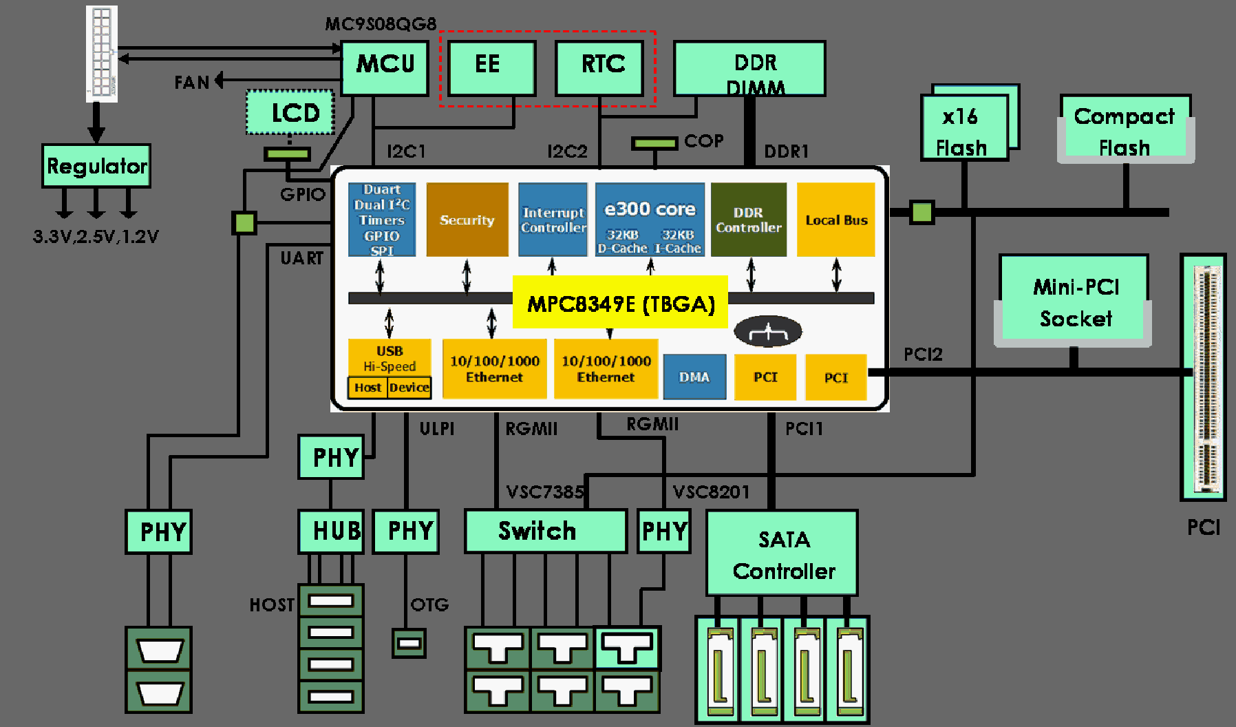 • Base-T PHY TSEC 2, GMII interface: five 10/100/1000 Base-T RJ-45 with Vitesse VSC7385 SparX-G5 5 + 1-port Gigabit Ethernet integrated PHY switch