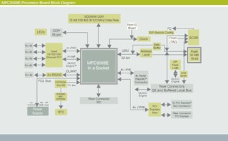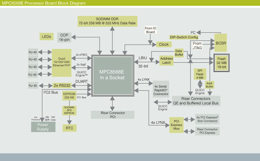 The MPC8568E Processor Board includes an MPC8568E processor running up to 1.33 GHz, along with circuitry to utilize the following: