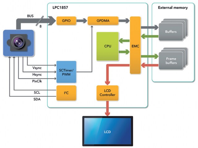This solution is adaptable to any 8 bit parallel camera modules with QVGA format. Included with the solution is a camera module that uses an 8-bit parallel output in RGB565 format with support for QVGA mode. The application is optimized for size and performance, and uses only eight percent of available CPU bandwidth. That means the LPC1857 can be programmed to perform a wide variety of additional functions, creating a complete system with a small, compact footprint.