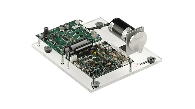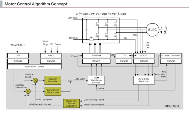 The MTRCKTSBN5643L motor control development kit is ideal for sensorless applications requiring one BLDC motor, like HVAC or electric pumps. The kit is designed to enable rapid prototyping and evaluation of the motor control application without having to wait for the final hardware design. This kit includes a 32-bit NXP® MPC5643L based controller board and the 3-phase low-voltage power stage board.