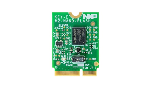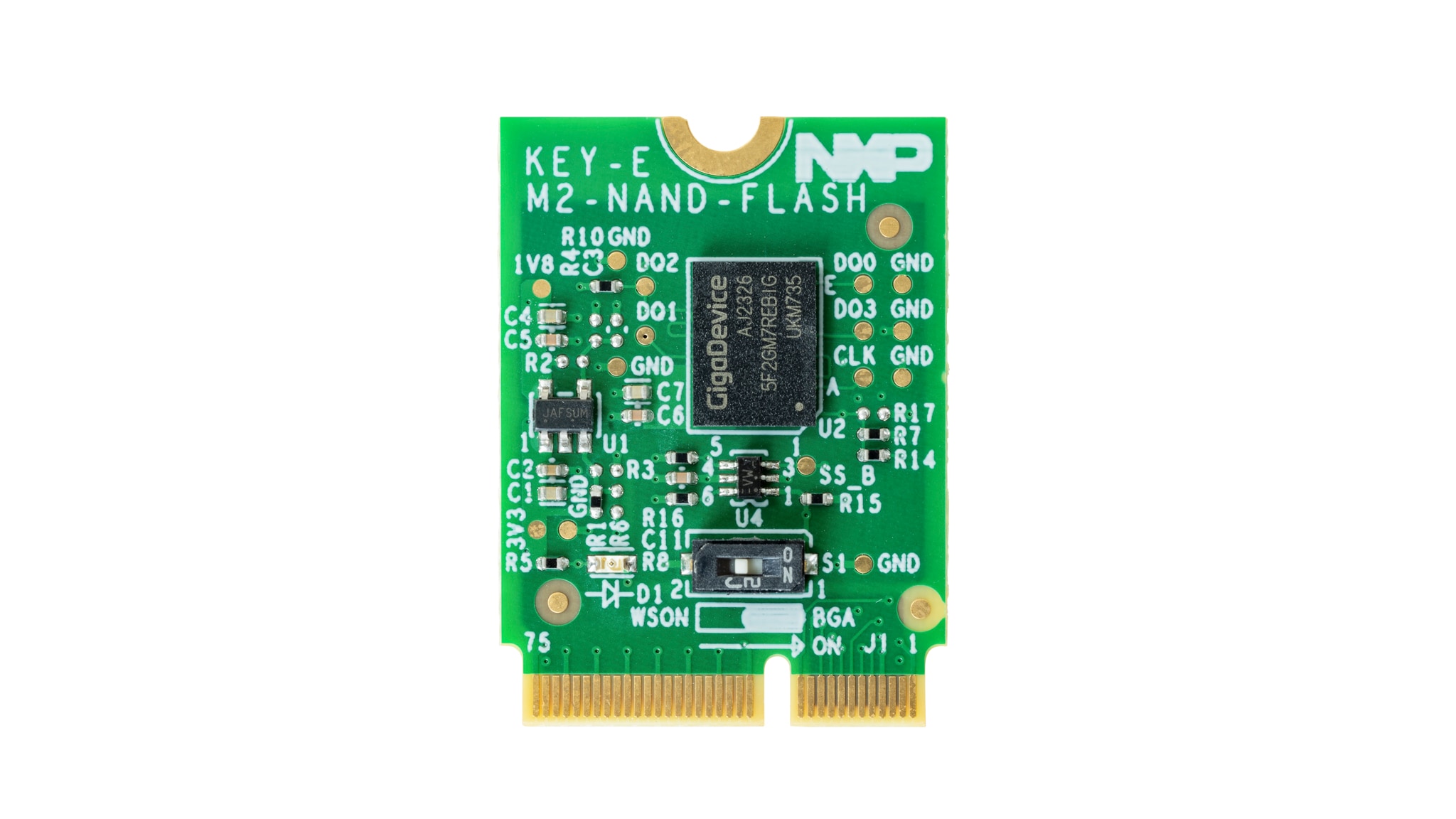 The M2-NAND-FLASH is an M.2 daughter card with two flash Winbond 256MB W25N02KWZEIR (WSON8x6) + GigaDevice 256MB GD5F2GM7REBIG (BGA24). Switches (S1) on the board allow the user to freely switch between the two flashes, this can also be switched using software by changing the level of the GPIO. This daughter card connects to the EVK board through the M.2 KEY-E connector.