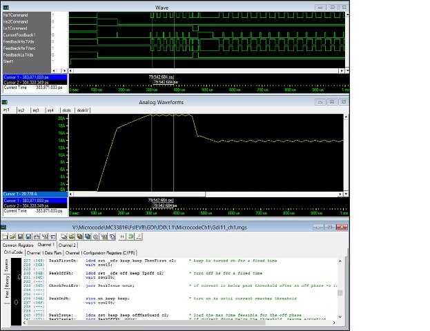 The ASA-33816-STD is an integrated design/simulation environment for the firmware required by the MC33816 family of NXP® programmable solenoid controllers (PSC). Starting with a specification for new/updated software, a software developer can use ASA-33816-STD to create a new project, implement the specification in firmware suited to the smart driver, have the PSC simulator compile the code into machine code, specify simulation commands and feedback, simulate the firmware behavior, correct errors (debug), and release the compiled code for inclusion into system software.