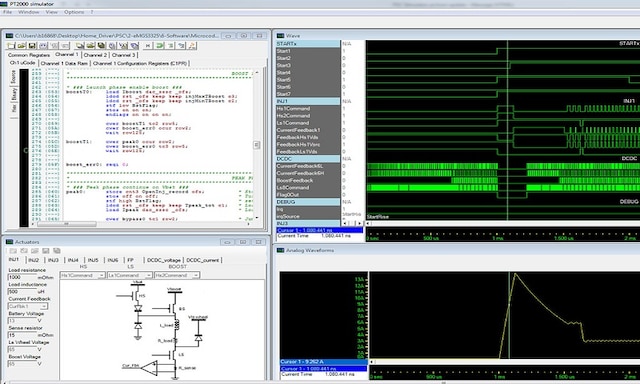 The ASA-PT2000-STD is an integrated design/simulation environment for the firmware required by the PT2000 family of NXP® programmable solenoid controllers (PSC). Starting with a specification for new/updated software, a software developer can use ASA-PT2000-STD to create a new project, implement the specification in firmware suited to the smart driver, have the PSC simulator compile the code into machine code, specify simulation commands and feedback, simulate the firmware behavior, correct errors (debug), and release the compiled code for inclusion into system software.