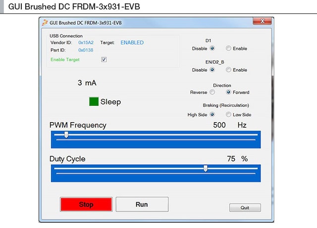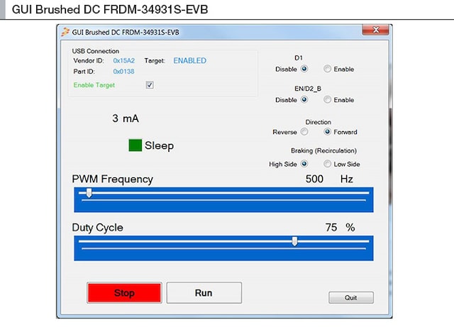 The GUI enables easy access to MCU I/Os controlling the PWM frequency, duty cycle, enabling/disabling while monitoring status flag pin for undervoltage, short circuit and over-temperature events as well as real time load current for implementing advanced diagnostics. Please refer to the user’s guide for accessing the procedure to install and use the GUI.