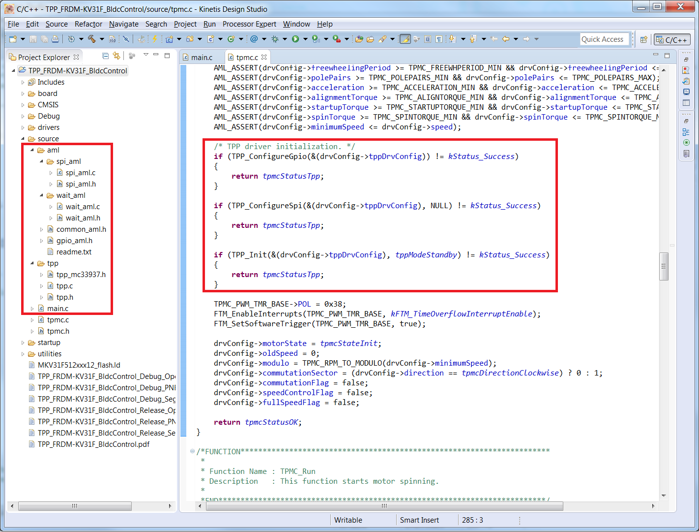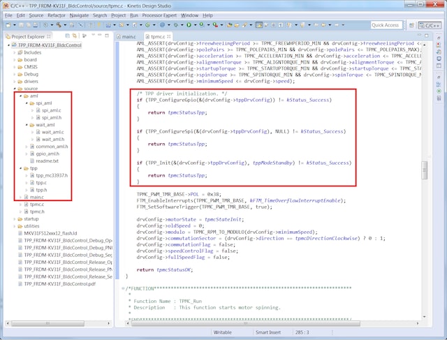 This embedded software solution provides high-level support for listed NXP analog parts (GD3000, MC33937 and MC34937). Included embedded driver provides access to all features of Three-Phase Brushless Motor Pre-Driver such as writing/reading SPI registers, dead time insertion and fault protection.