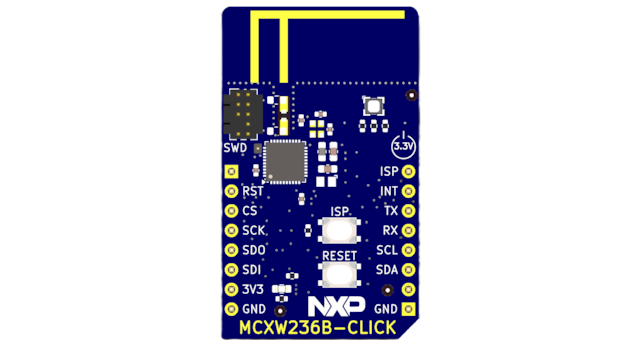 The MCXW236B-CLICK is an add-on board that enriches NXP’s expansion board hub with a Bluetooth LE Click board that enable connectivity to a wide range of MCU and MPU FRDM boards. This board features the MCX W23 Bluetooth® Low Energy (LE) 5.3 wireless microcontroller unit (MCU) and once connected to the existing FRDM boards, it offers easy evaluation and rapid prototyping of the MCX W23 wireless MCU. Connecting this board with FRDM MCXC or MCXN can also provide a medium to further explore the ADC/DAC capabilities.
