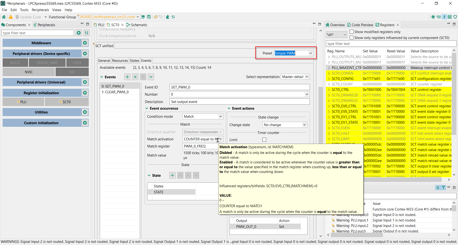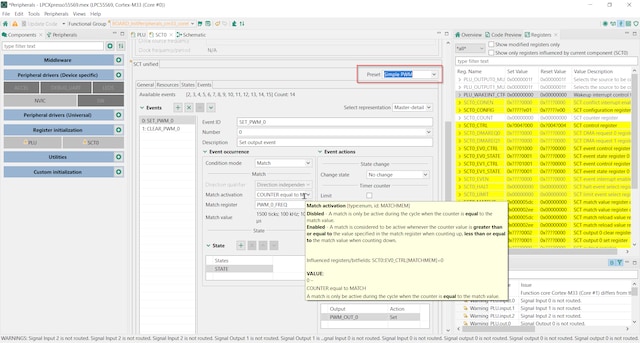 examples of PWM timer implementations using the SCT, and the MCUXpresso