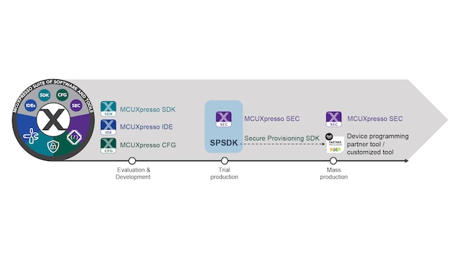 NXPでは、量産試作および量産用にMCUXpressoセキュア・プロビジョニング (SEC) とセキュア・プロビジョニングSDK (SPSDK) を提供しています。SECツールとSPSDKはどちらも、生産段階におけるNXPのマイクロコントローラおよびi.MX 9アプリケーション・プロセッサでのセキュア・プログラミングとデバイス・プロビジョニングをサポートします。