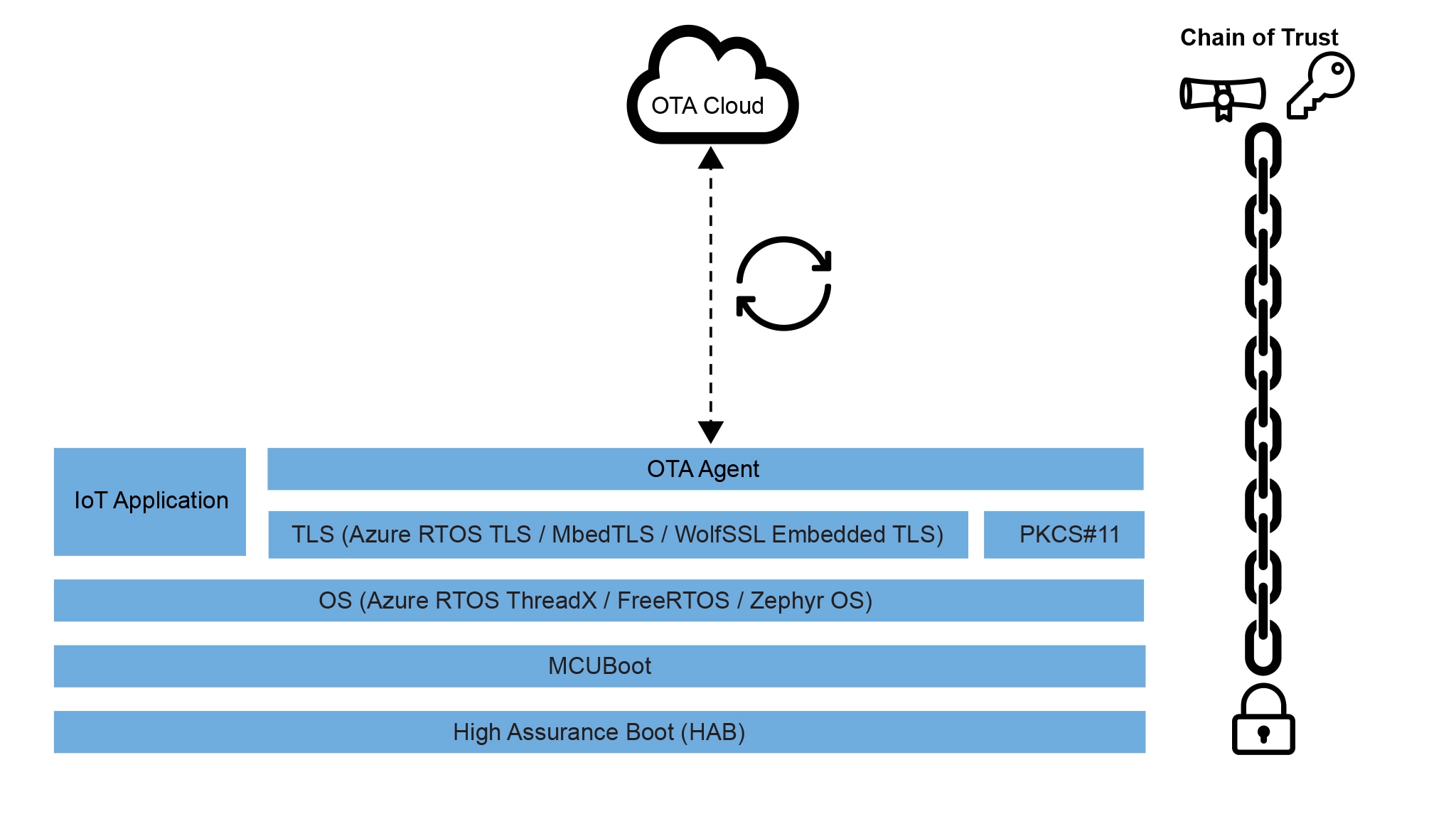 Over-The-Air (OTA) or over wired network updates allow IoT device makers to manage their cloud connected devices and deploy software updates when necessary. A secure OTA update framework is critical, as it ensures the chain of trust of the entire system, from NXP's device immutable based boot code to the OTA agent which interacts with device management services. NXP and its partners collaborate to provide secure OTA framework implementation based on NXP's security-enabled microcontrollers and processors, providing ready-to-use implementations that can be customized for specific customer needs.