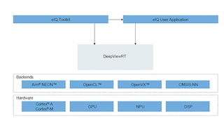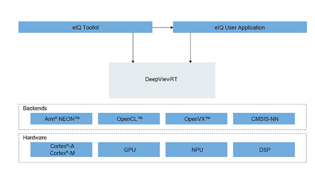 eIQ Inference with DeepViewRT™ is a platform-optimized, runtime inference engine that scales across a wide range of NXP devices and neural network compute engines. Provided free-of-charge, this inference engine enables compact code size for resource-constrained devices including the i.MX RT crossover MCUs (Arm® Cortex®-M cores), i.MX applications processors (Cortex-A and Cortex-M cores, dedicated neural processing units (NPU) and GPUs).