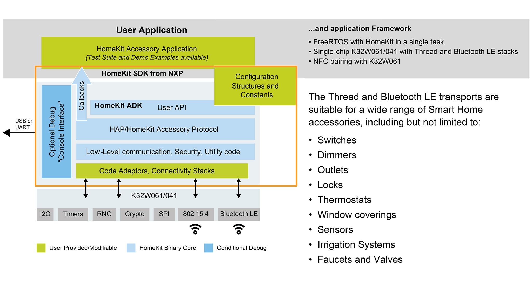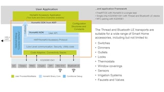 The HomeKit Software Development Kit (SDK) from NXP offers support for a wide range of home automation applications using Apple HomeKit technology, delivering great performance, advanced security and supporting Thread, Bluetooth® Low Energy, Wi-Fi, and Ethernet transports. This HomeKit solution is architected for standalone and hosted system configurations for a range of NXP microcontrollers (MCU) and Linux enabled i.MX application processors.