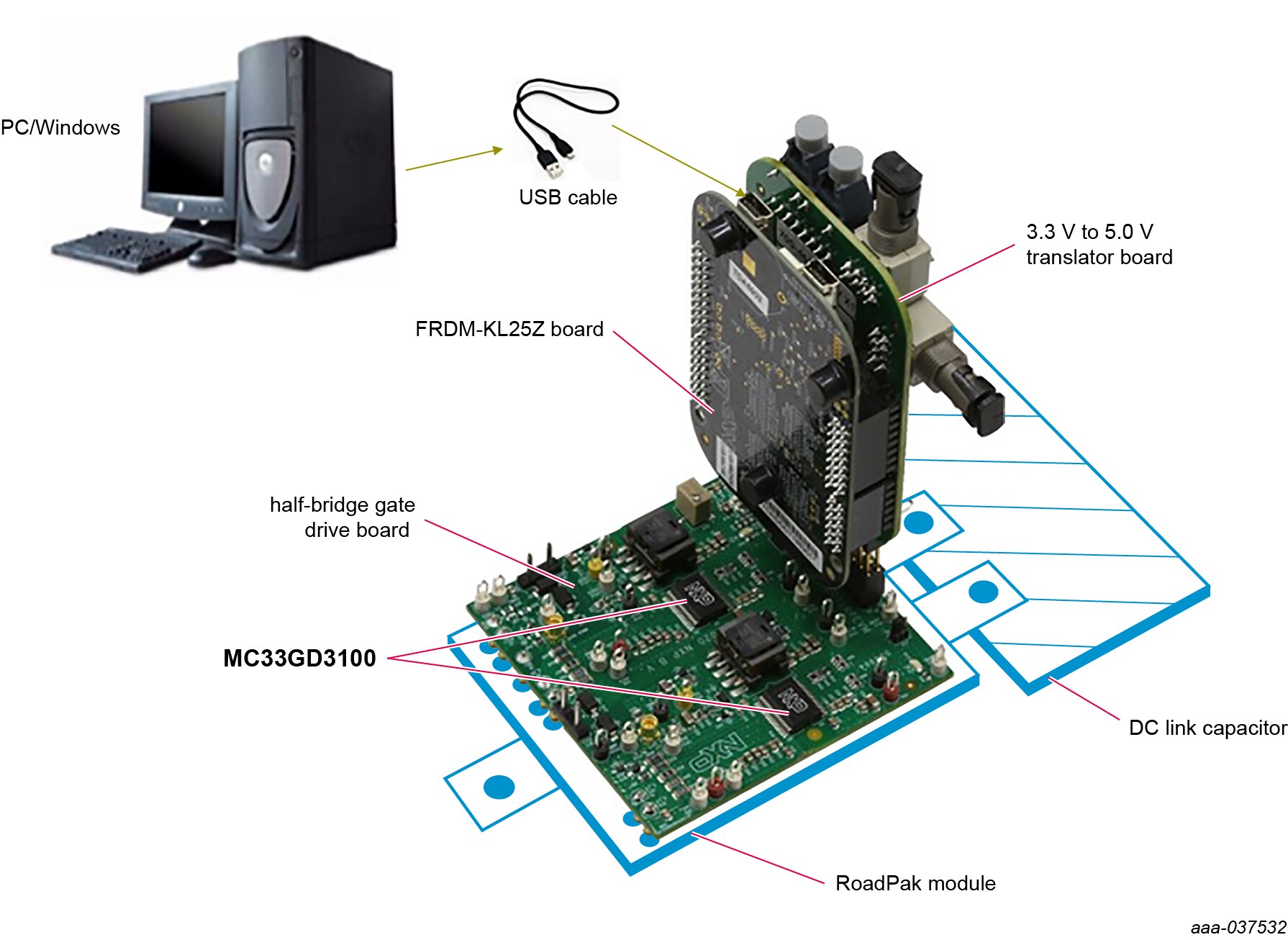 The FRDMGD31RPEVM is connected to a compatible SiC MOSFET RoadPak module with a DC link capacitor. Double pulse and short-circuit testing can be conducted using a Windows based PC with FlexGUI software.
