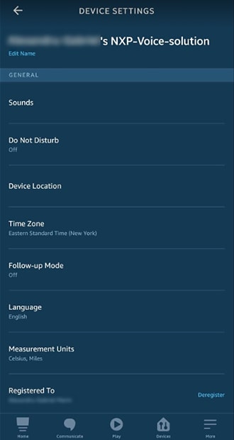 The SLN-ALEXA-IOT device should be listed with the name “NXP Development Kit”. Click on it to control it using the controls shown in the next images.