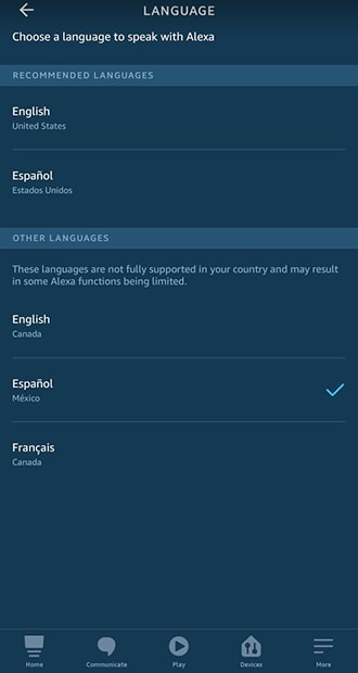 Next, clicking on “Language” will open a screen with the languages that the device reported as being supported. We are demonstrating here the locale change to “es-MX”.