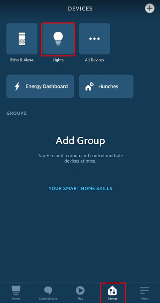 In order to control SLN-ALEXA-IOT's Smart Home capabilities from Alexa App, in “Devices” screen, select Lights, as shown below.