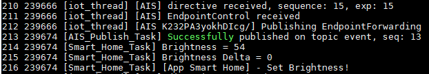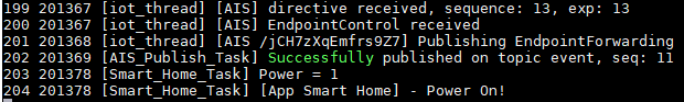 The firmware on the device is using Smart Home APIs. Moreover, it is emulating a light switch. This means the user can control it either from Alexa App or through voice commands as it would be a light switch smart device. Please note that the Smart Home callbacks are not controlling any actual hardware, like an LED for example. They were implemented to simply log something to the console every time a Smart Home directive is received from the cloud.