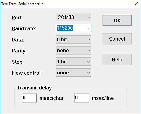 5. Configure the serial port settings (using the COM port number identified earlier) to 115200 baud rate, 8 data bits, no parity and 1 stop bit. To do this, go to Setup -> Serial Port and change the settings