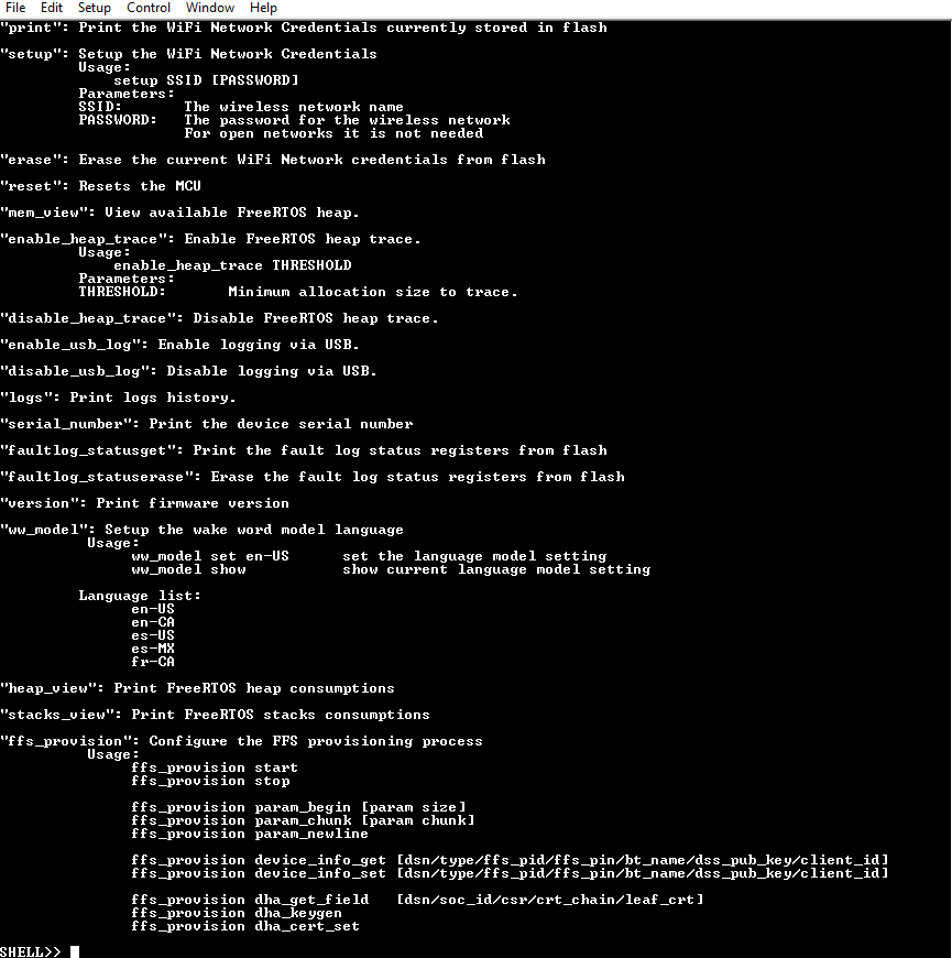 Press Enter on the keyboard and you will see the SHELL>> prompt. Type help to show the available commands. Figure below shows the available commands, with a description of each.
