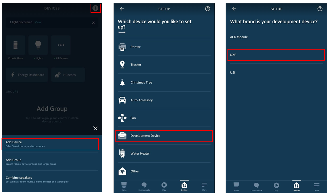 Select the Devices tab, then select the plus sign + . In the popped-up window, select Add Device. Select Development Device from the list shown. Select NXP for What brand is your development device, then click next.